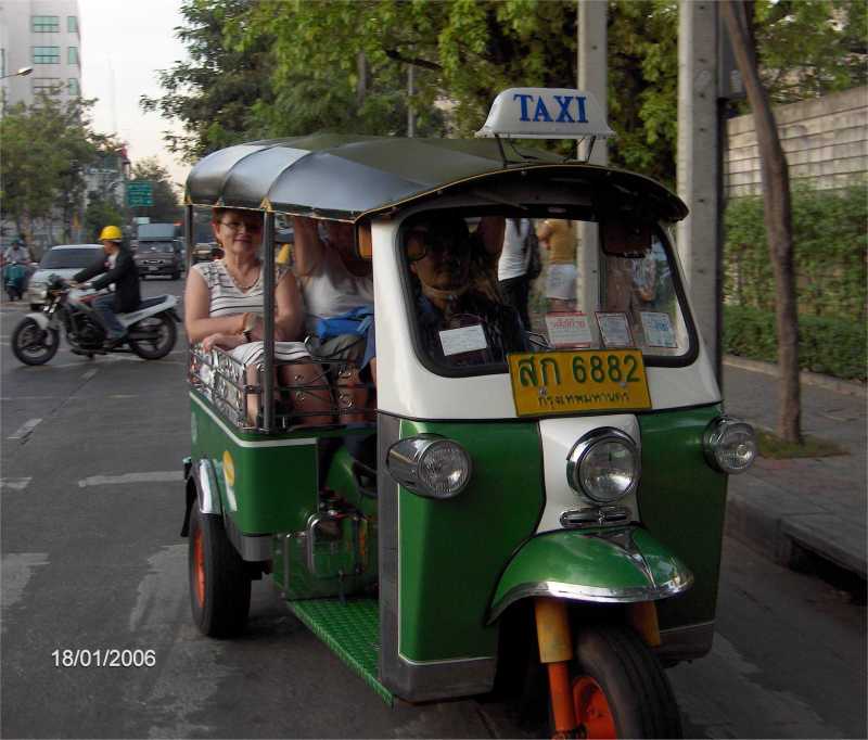 Bangkokissa voi myös kokeilla kolmipyöräistä tuk-tukia eli mopotakseja, niitä on aina saatavilla ja kyyti on vauhdikasta.